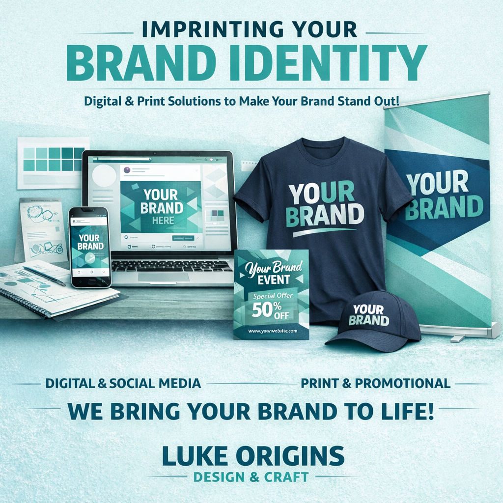 At Luke Origins, we help translate your brand identity across every touchpoint—digital platforms and physical materials alike. From online content to printed pieces like flyers, banners, signage, and apparel, we ensure your brand looks and feels cohesive wherever it’s seen. The result is communication that not only looks professional, but leaves a lasting impression.